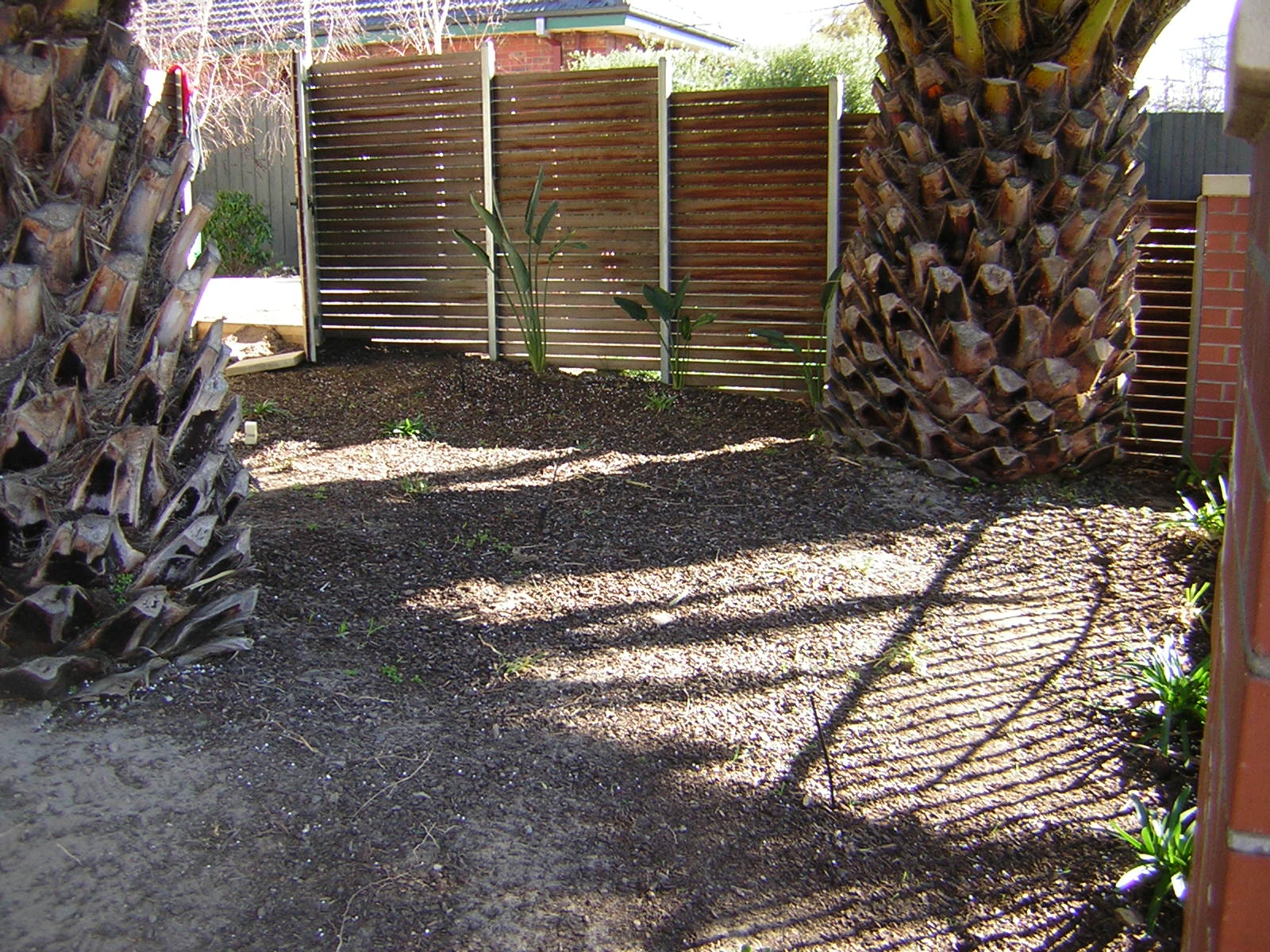 Inside the walled area we also ran the drip irrigation and boarded the whole area with Waterhousia Floribunda and underplanted with liriope muscari. In the center of the old lawn area we built a garden bed with a multi stemed Bangalow palm and surrounded it with the Waterhousia's and liriope.