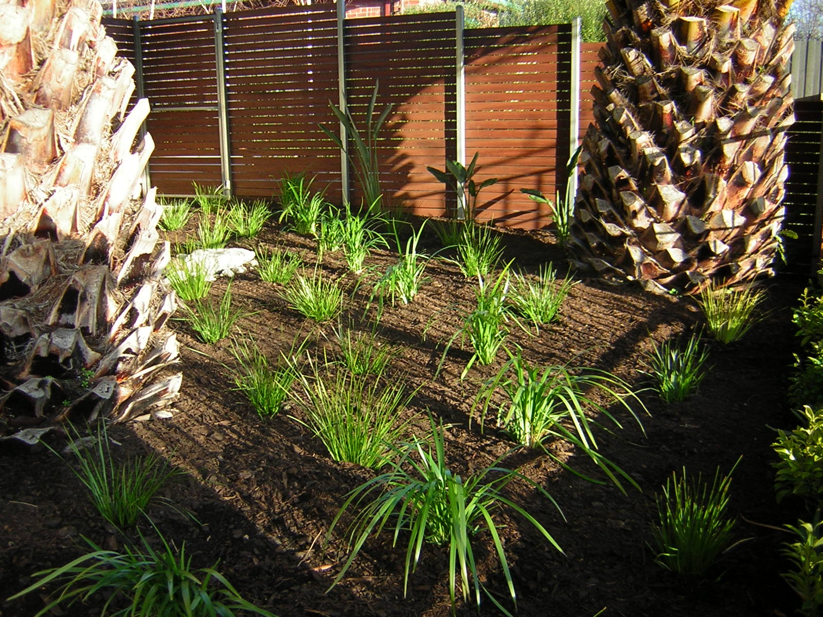 Out the front we scrapped back the garden and installed a drip irrigation system. After that we mass planted dianella "breeze" and Lomrada "Tanika" in drifts through the two beautiful Canery Island Date Palms.