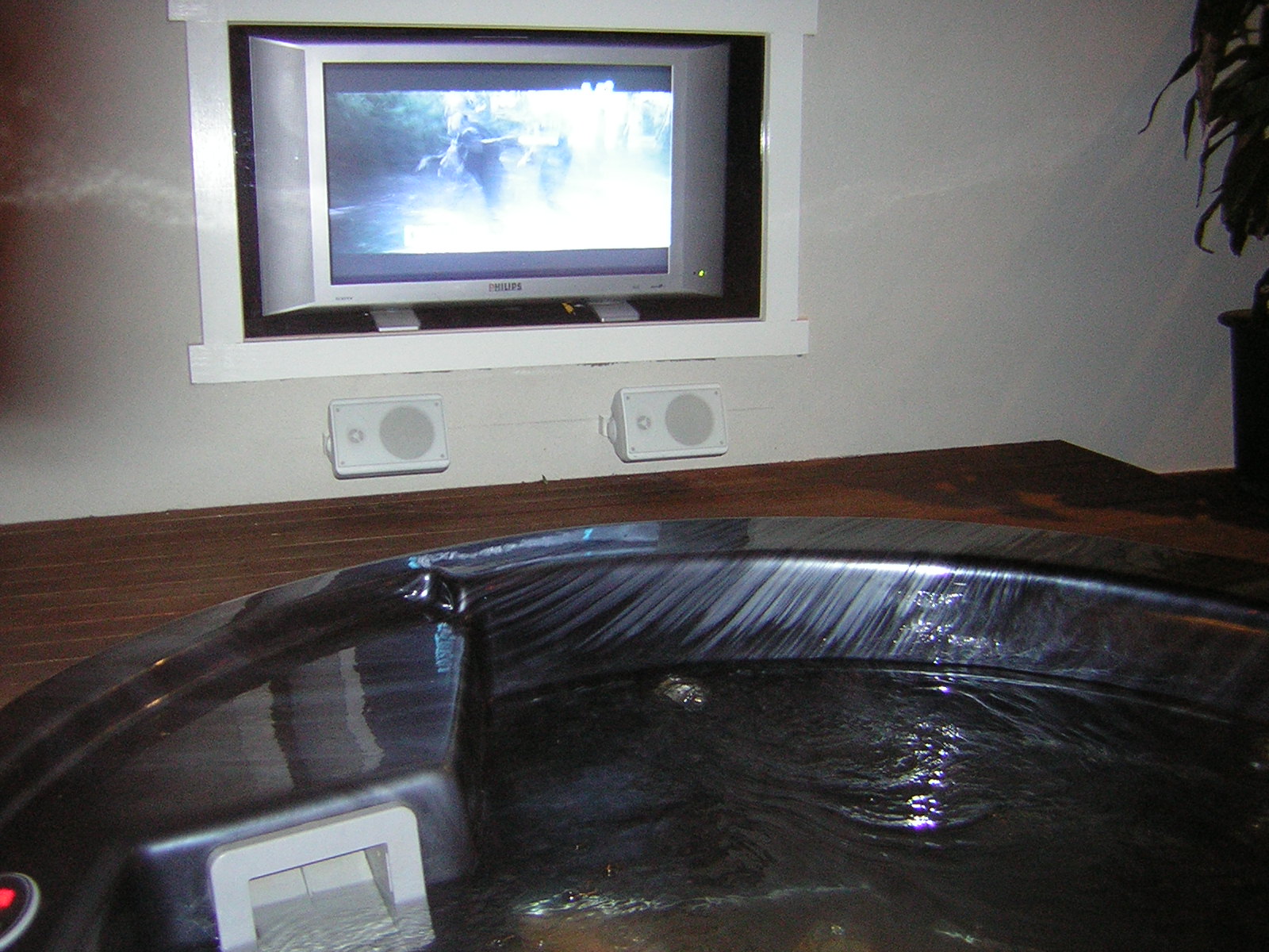 In the relaxing area we were able to bring in, during the early stage of construction on this property, a 4 person self contained spa. Without all the excess baggage of most spas (external heater, filter systems ect) this is a "cheaper" option for a spa. The main feature of this area is no doubt the outdoor entertainment. When the extension was done we added in a weather proof box for the outdoor plasma tv setup. Once the extension was finished we ran wires from an internal TV so that whatever was played on that tv was also on the external tv. The external speakers are marine grade quality and added to this they are hooked up to a DVD / CD / radio player inside completing this wonderful "outdoor living space".