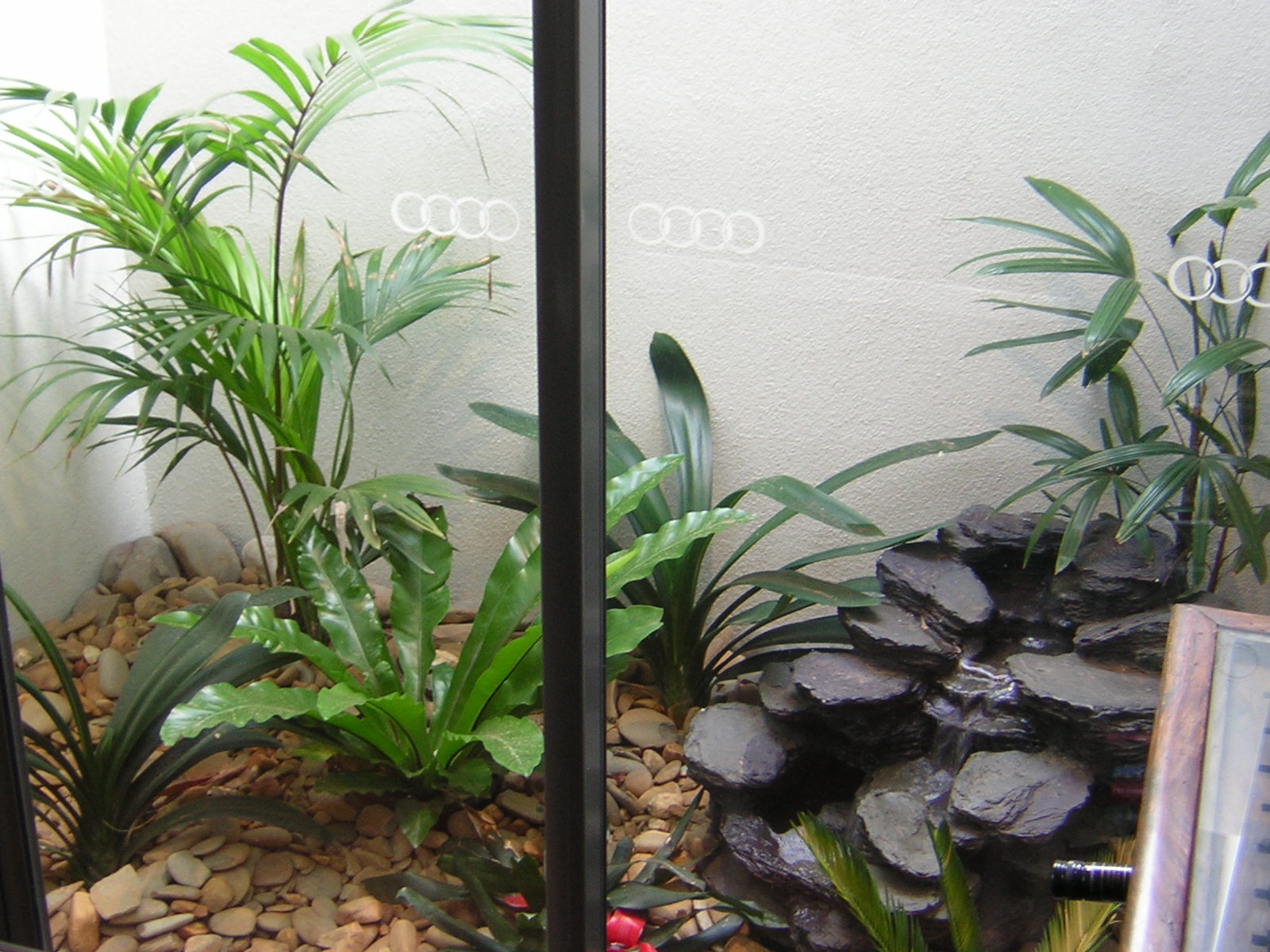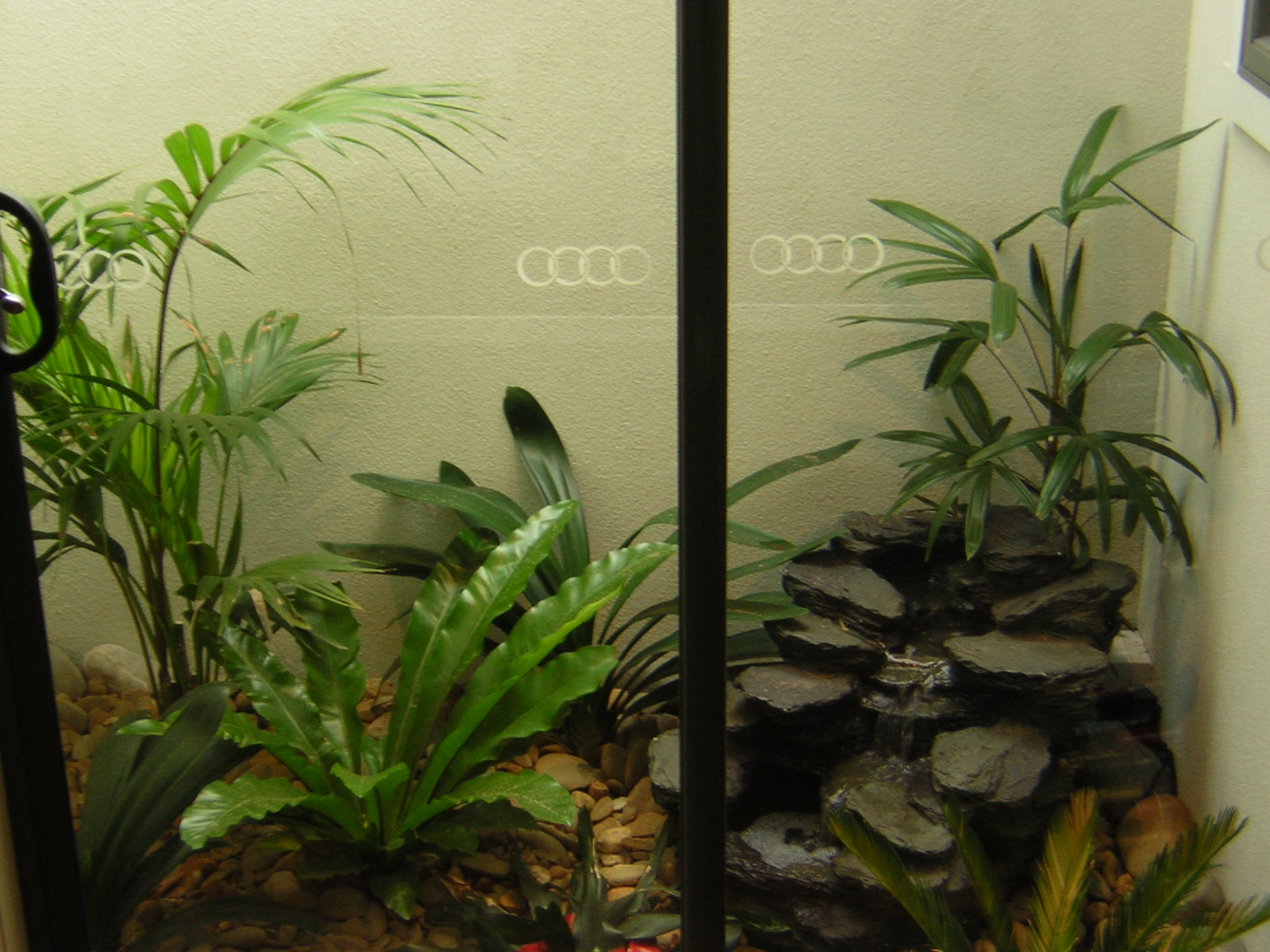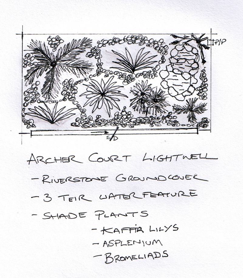 Due to the small size of these courtyards (generally) it is very importatnt to only chose plants that will not overgrow the area. Also these courtyards usually do not recive any direct sunlight and thus require shade loving plants like kaffa lillies, bromelaids and asplenium.